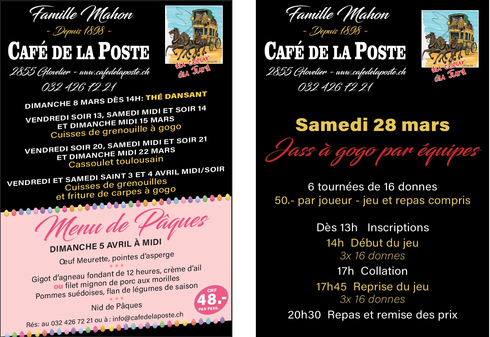 Evénements 14 Fév 2025 Evénements début 2025 Samedi 11 janvier : Concours central Samedi 18 janvier : Soirée cuisses de grenouille Vendredi 24 au dimanche 26 janvier : Chasse de la région Vendredi 7 et samedi 8 février : Moules - Frites Vendredi 14 février : St-Valentin 20 Avr au 20 Avr 2025 Evénements mars-avril 2025 VENDREDI 21 MARS Cuisses de grenouille à gogo SAMEDI 5 AVRIL NOUVEAU : soirée «bouillabaisse traditionnelle » (réservation obligatoire) VENDREDI SAINT 18 ET SAMEDI 19 AVRIL Soirées cuisses de grenouille à gogo et toujours notre friture de carpe tout le week-end DIMANCHE 20 AVRIL Menu de Pâques 04 Avr au 04 Avr 2025 Bouillabaisse traditionnelle Samedi soir 5 avril 11 Mai au 11 Mai 2025 Fêtes des mères 2025 DIMANCHE 11 MAI 2025 15 Aoû au 17 Aoû 2025 Cuisses de Grenouille Vendredi – Samedi - Dimanche 15-16-17 août 2025 12 Sep au 13 Sep 2025 Soirée Moules-frites à GOGO Vendredi soir 12.09.25 Samedi soir 13.09.25 Dès 18h30 CHF 29.— par personne 05 Déc au 07 Déc 2025 Marché paysan et cuisses de grenouille À GOGO Marché paysan Vendredi 05.12.25 : de 17h00 à 21h00 Week-end cuisses de grenouille Samedi soir –Dimanche midi : 6 et 7 décembre 2025 20 Déc au 20 Déc 2025 Jass au cochon Samedi 20 décembre 2025 17 Déc 2025 Menu spécial Noël Mercredi 17.12.2025 Afficher la carte 01 Jan au 01 Mar 2026 Evénéments 2026 Découvrez nos événements pour 2026 Voir les événements 08 Mar au 06 Avr 2026 Evénements mars-avril 2026 Découvrez nos événements de mars à avril 2026.